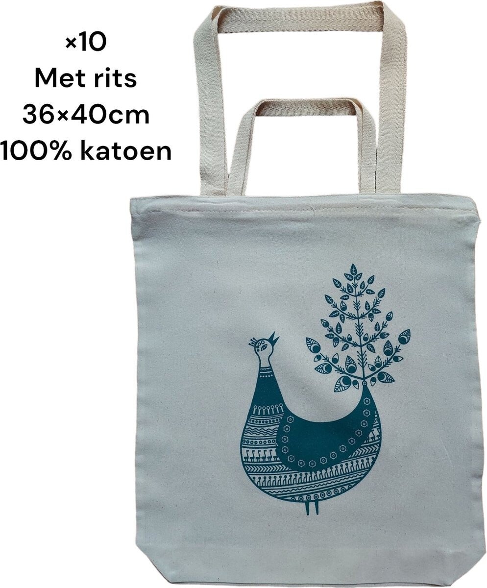 Canvas Tote Bag - Naturel - 270gr katoenen - 36x40x10cm - Met rits - 10 Stuks - zingende vogel.